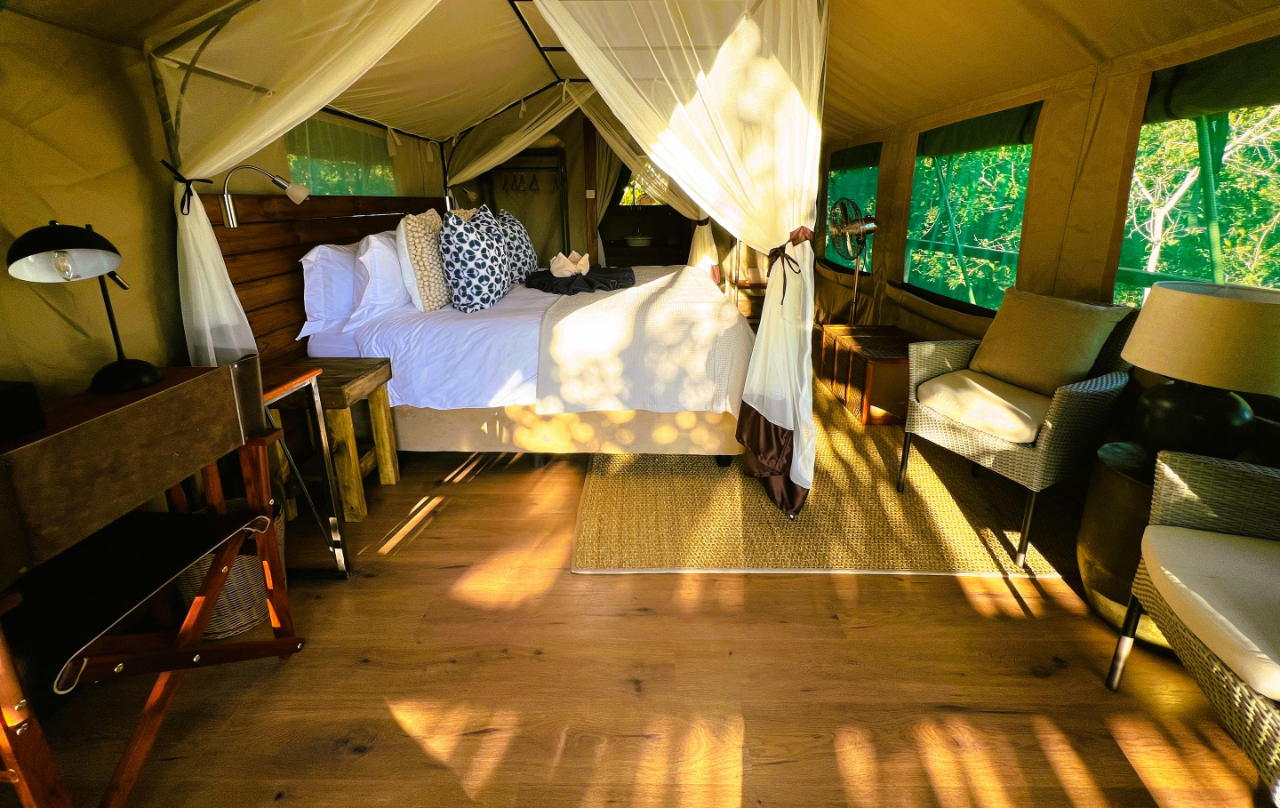 Setari Camp accommodates 20 guests in 8 light and airy tents and 1 suite designed for families. Each tent cleverly combines understated luxury with an authentic and relaxed home-from-home atmosphere. The camp resembles an enormous tree-house where the entire construction is elevated with wooden walkways linking the impressive sitting and dining areas, pool-with-a-view, gym and curio shop. All of the tents have private decks with spectacular views over the Okavango. Safari activities available at Setari include bushwalking, boating or gliding gently through the waterways in a traditional Mokoro (dug-out canoe). Delicious home-cooked food, super-comfy accommodation and superb guiding all combine to making Setari a hidden treasure in the iconic Okavango Delta.
