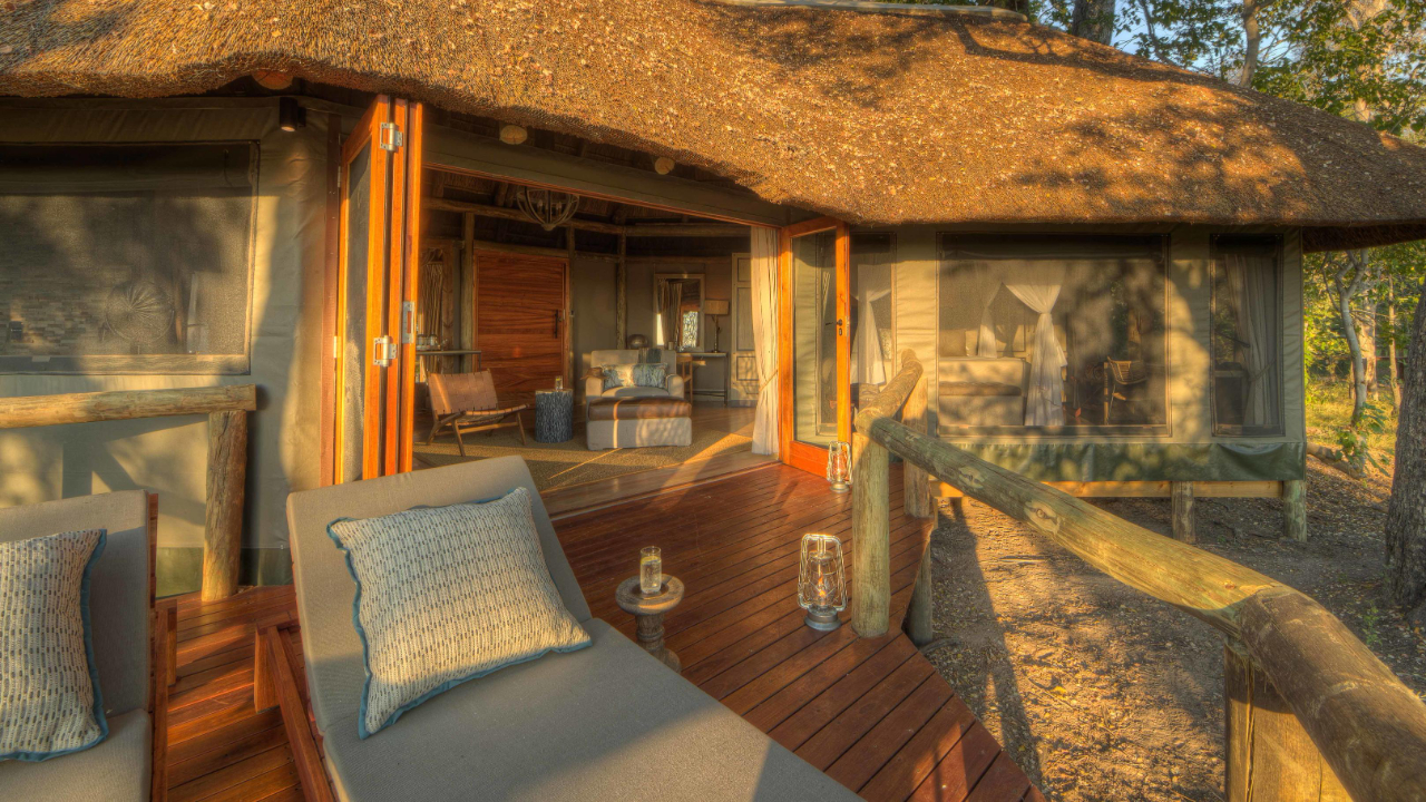 Camp Okavango is located on the remote Nxaragha Island in the Okavango Delta. Guests are assured of a fantastic wildlife experience at Camp Okavango. Its location in the heart of the Okavango Delta means that wildlife sightings are rife. Hippos, elephants, antelope, wild dog and predators like lion are all present in the area. Days at Camp Okavango are spent enjoying mokoro canoes, bushwalks along the islands of the delta, fishing or just birdwatching from the comfort of the lodge. Camp Okavango is home to 11 luxury tented suites as well as a family suite. Each suite is built on its own raised platform and comes equipped with an en suite bathroom and a private viewing deck. At night guests can enjoy a drink at the bar being ushered into the expansive dining deck.