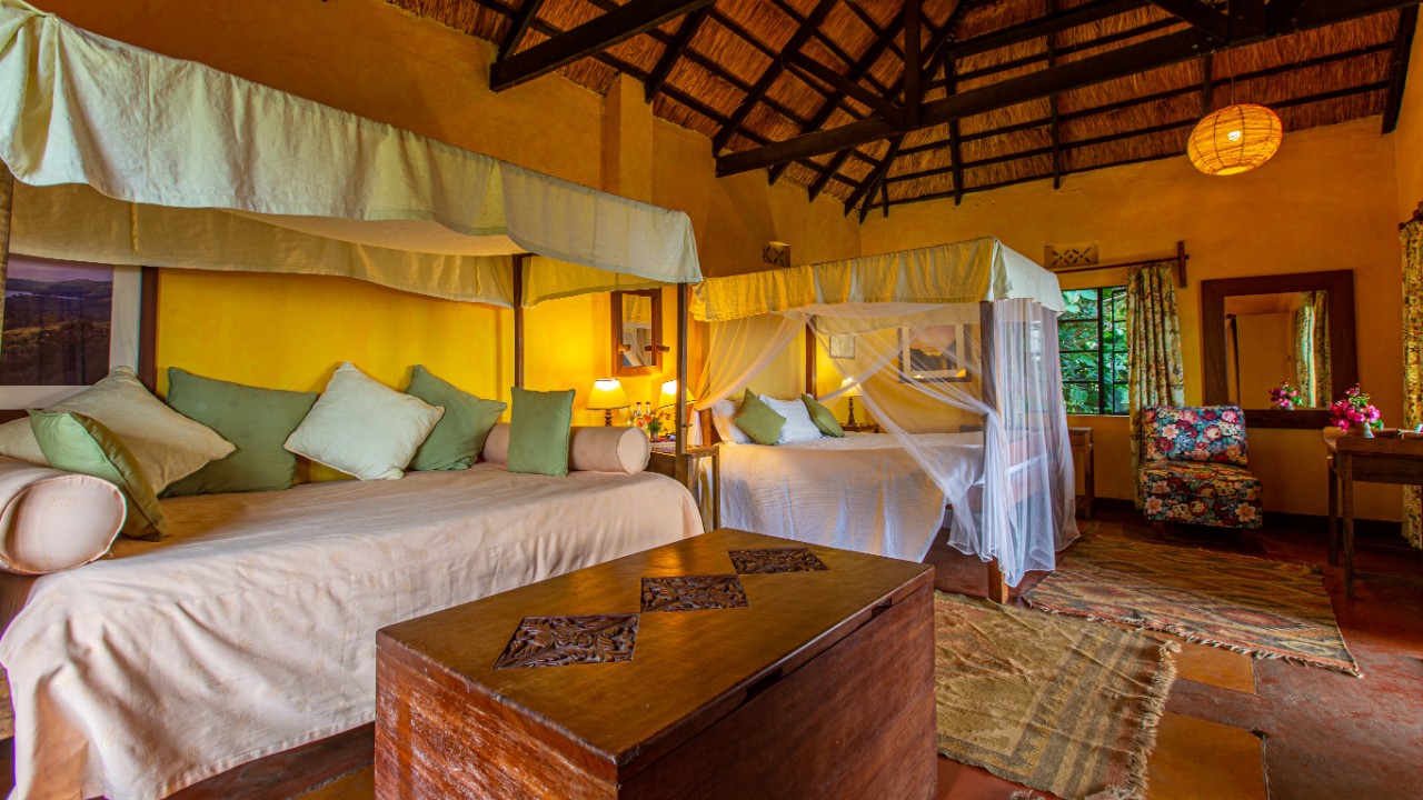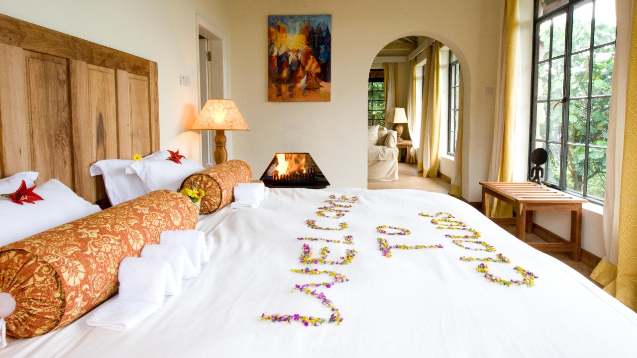 Guests stay in individual stone cottages with large private sitting rooms complete with fireplace, overstuffed armchairs, and art commissioned from some of Uganda’s best artists.