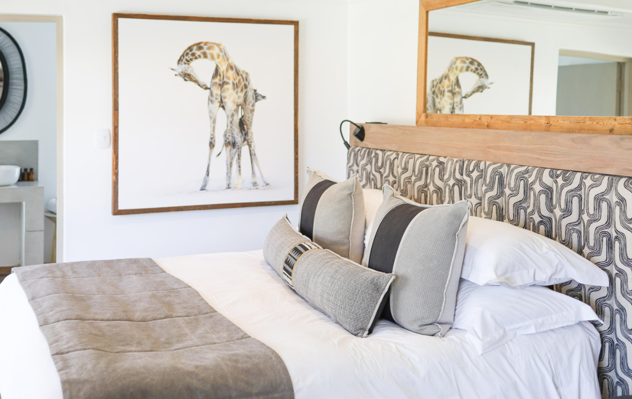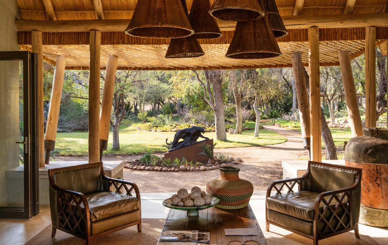 This elegant safari lodge is the perfect mix of authentic tradition with a modern twist. The convivial and art-filled living areas lead out to expansive terraces. Beyond lies the mature indigenous garden which naturally evoke a sense of tranquillity and relaxation. Enjoy the serenity of the many huge fever and baobab trees, read a book in the swing chair, or watch the game at the waterhole where animals come to drink through the day.
