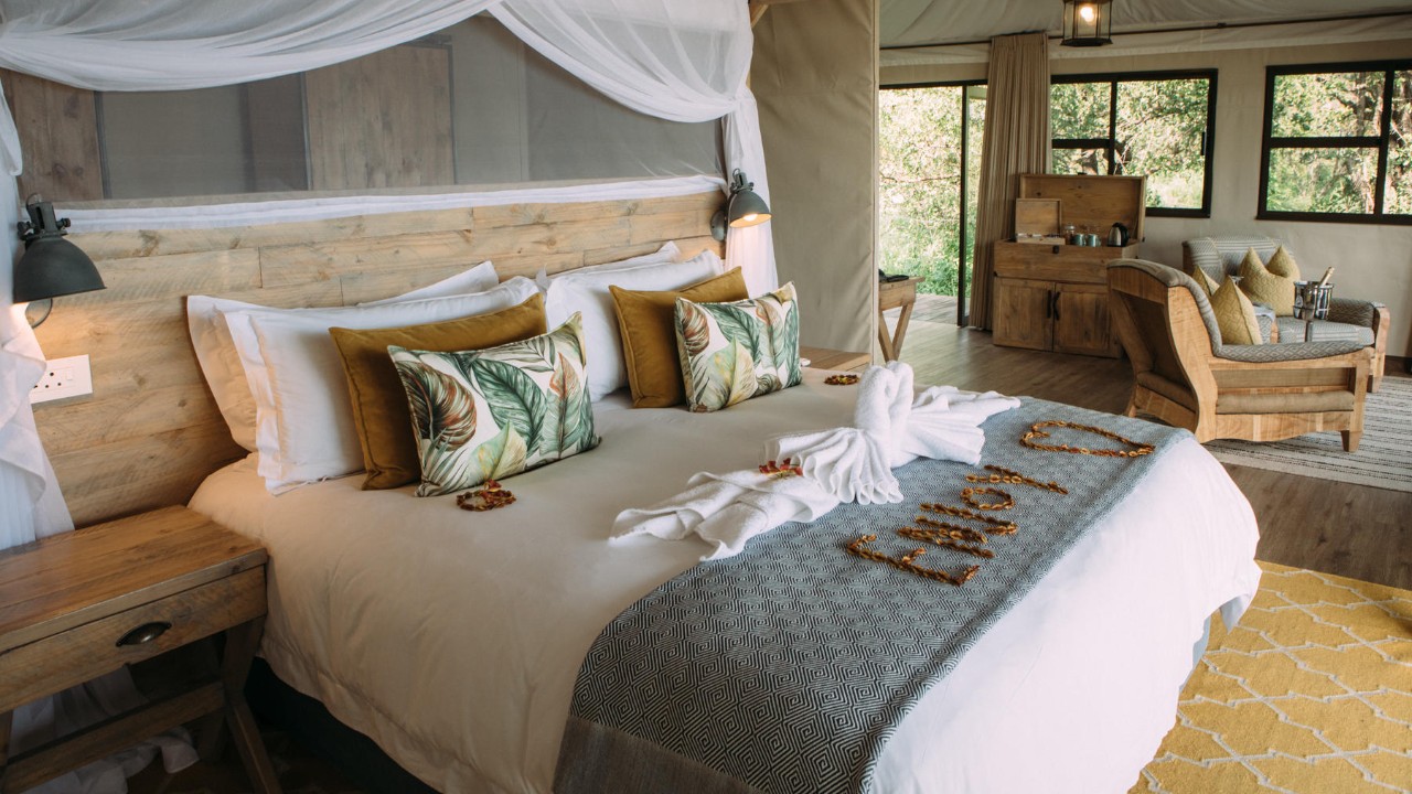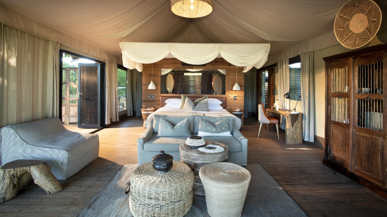 Somalisa Camp is an award-winning tented safari camp set in the Hwange National Park, Zimbabwe. The area around the camp is known as “The Land of the Giants” because of the large elephant herds that are often seen around. Somalisa offers guests a wonderful getaway with breathtaking views of the Kennedy Vlei line. The camp consists of seven beautifully appointed Sail Tents with sliding doors, a glass wood-burner for cold nights and a floor fan for warm days. Each tent is fully en-suite with an indoor and outdoor shower and copper bathtub. The main deck is perfect for guests to relax and enjoy the views – the deck consists of a lounge and dining area as well as a small splash pool overlooking the waterhole.
